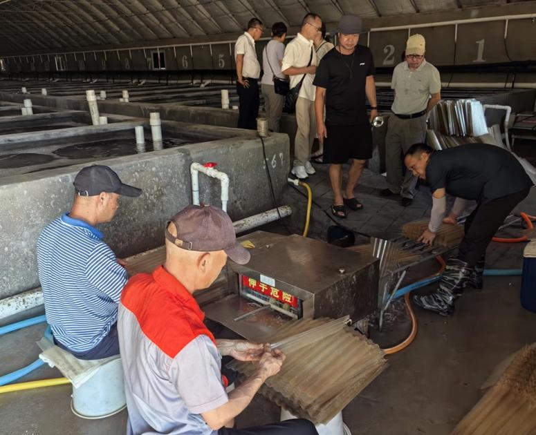在本次活动中,科特派团队在盈瑞海洋渔业有限公司卢慧珍总经理的陪同下,现场实地考察了企业车间参苗生长状况及工厂化养殖示范项目。专家们就水质水温调控、室内环境管理、人工饲料配方优化,以及由团队成员黄奶秋与霞浦鸿鑫机械有限公司联合发明的软颗粒饵料机应用等关键技术环节,与企业技术人员展开深入交流探讨。