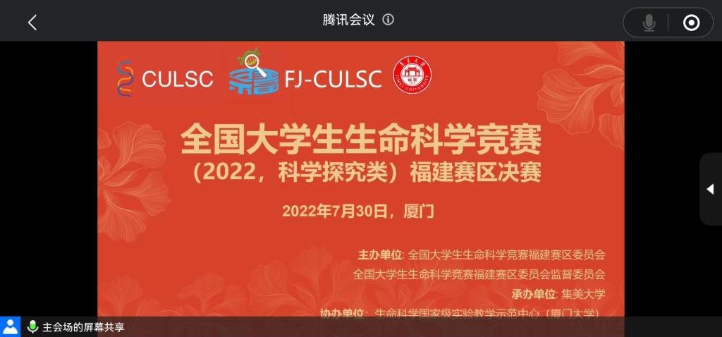 2022年7月30日,由全国大学生生命科学竞赛福建赛区委员会主办、集美大学承办、厦门大学生命科学国家级实验教学示范中心协办的全国大学生生命科学竞赛(2022,科学探究类)福建赛区决赛在厦门集美大学拉开帷幕,十大网投官网共有18支队伍参加此次竞赛,其中6支队伍成功进入省赛。经过紧张激烈的专家审评和线上答辩,十大网投官网学子在本次全国大学生生命科学竞赛中喜获国家三等奖一项,省赛二等奖一项,省赛三等奖五项。