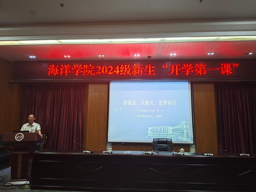 紧接着,学院党委书记周建辉教授以《朝着海,向着光,逐梦前行》为题,为新生们上了生动而深刻的开学第一课。他强调,作为新时代的青年学子,应当勇于担当,积极作为,将个人理想融入国家发展大局之中,以实际行动诠释青春的价值与意义,不负韶华,逐梦前行。