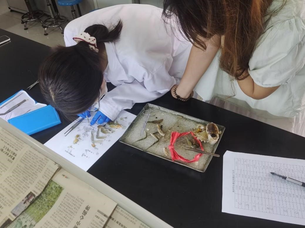 生物实验楼201室则上演着指尖上的“艺术”——大黄鱼与拟穴青蟹解剖比赛。选手按抽签任务操作:选择大黄鱼者需在10分钟内精准分离全鳃、胃、肠、肝脏等10个关键器官并准确摆放;选择拟穴青蟹(俗称青蟹)者则需按序完整分离并标注附肢、呼吸、循环、消化等系统的20个部位。解剖刀与镊子在选手娴熟专注的操作下飞舞,课堂知识精准转化为实操技能。