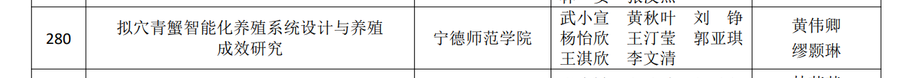 近日,第十七届“挑战杯”福建省大学生课外学术科技作品竞赛结果公布。经过激烈角逐,十大网投官网黄伟卿、缪颢琳教师指导的《拟穴青蟹智能化养殖系统设计与养殖 成效研究》项目获省赛三等奖。