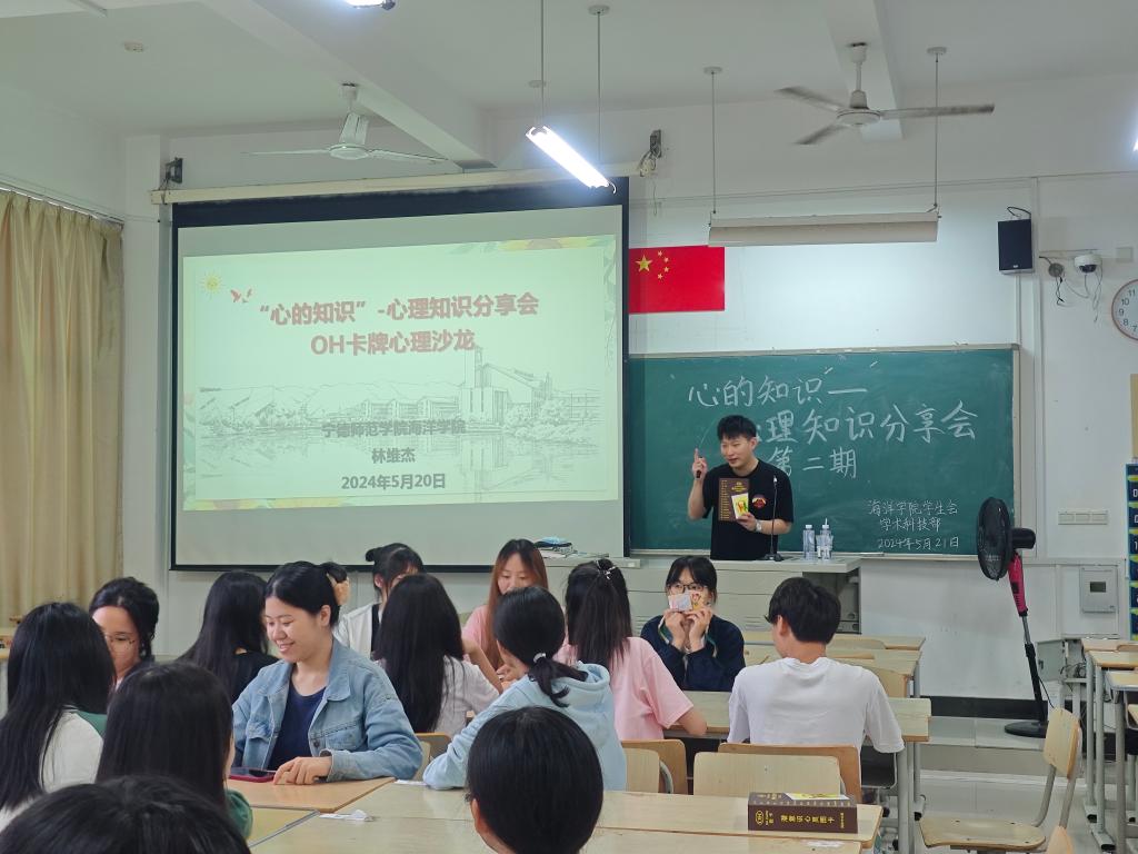 分享会开始时,林维杰通过卡牌游戏开启活动,通过讲述卡牌意义使同学们可以帮助探索自我,理解亲密关系、职场关系等。在团体和组织层面,帮助成员之间更好地沟通和理解。在有趣的分享会中,他用卡牌向同学们介绍了很多专业的知识,使同学们耳目一新。最后,林维杰进行总结与讨论,重点分享了心理专业知识。