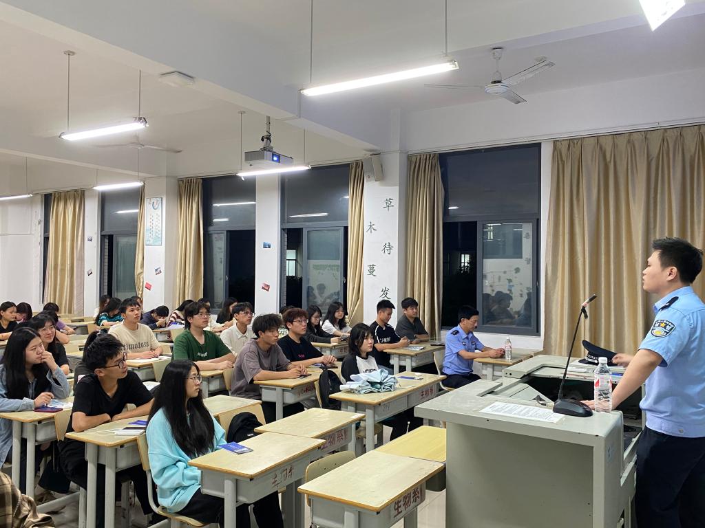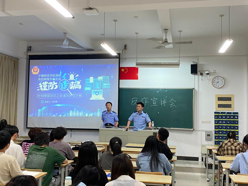 李东铭警官为同学们发放反诈宣传手册,并结合新型诈骗手段,生动形象的介绍了刷单返利、虚假网贷、网络诱惑等十大高发类案例。活动上,李警官通过播放系列反诈宣传视频,以案说法,指出诈骗往往遍布于身边,提醒同学们要提高警惕,练就火眼金睛,用好国家反诈中心APP这一反诈利器,守住自身的“钱袋子”,牢记“八个凡是”,共同构建全民反诈新格局。