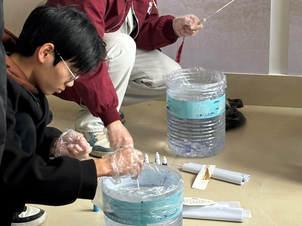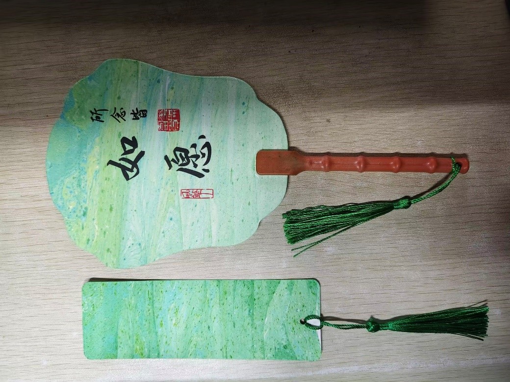 活动开始,工作人员向在场同学们演示了漆扇的制作方法,细心指导同学们一些制作的小技巧。同时,工作人员准备了一个个小巧精致的书签,形状各异的漆扇,以及一旁等着的漆桶和颜料。待工作人员细心指导完后,同学们满怀期待地开启了漆扇创作之旅。有的同学内心细腻,注重配色与图案的搭配;有的同学大胆创新,运用鲜艳夸张的色彩搭配;还有的同学技术高超,制作出奇妙的图案。活动现场气氛热烈而温馨,同学们相互交流创作灵感,彼此分享漆艺技巧,赞叹声与欢笑声交织在一起,充满了整个活动室。