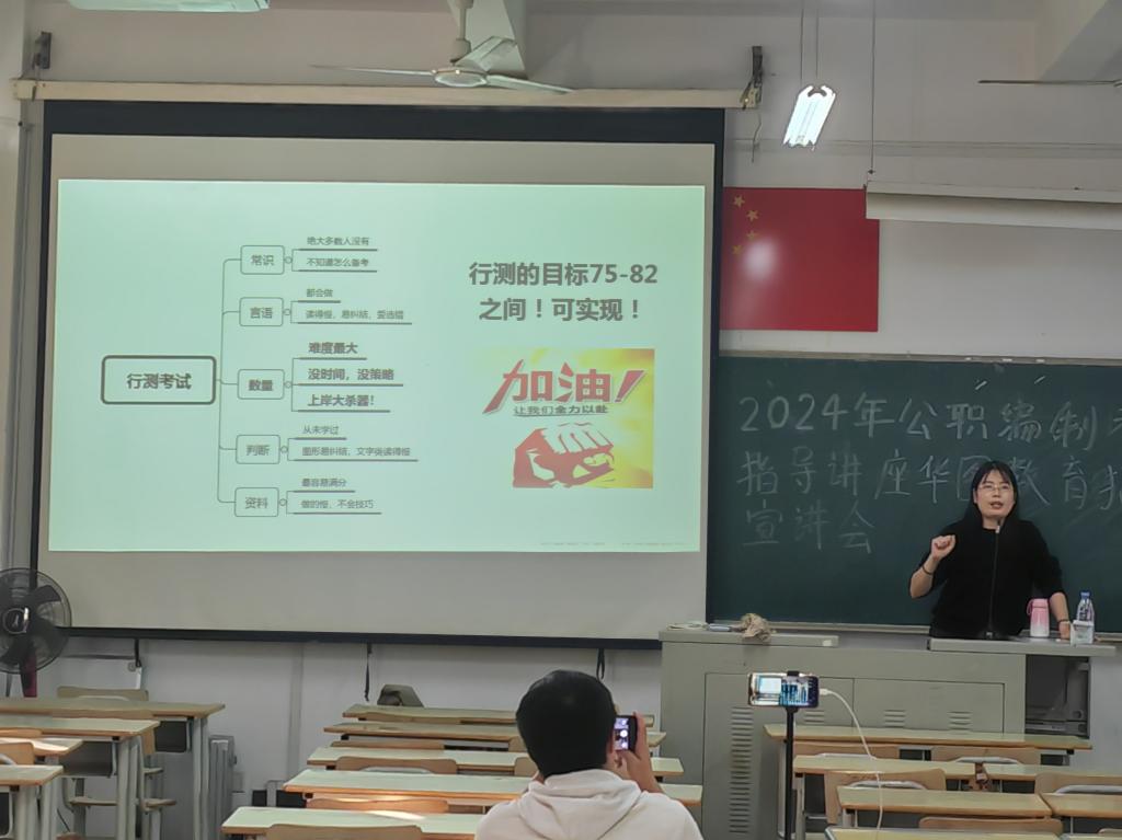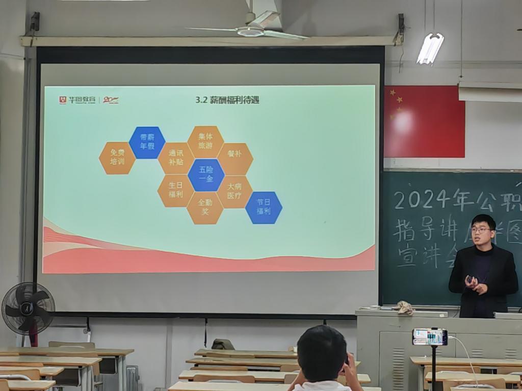 招聘会伊始,华图教育招聘人员谢惠玲以讲述自身的经历为开头,简要介绍关于公职编制考试的相关内容,让与会同学对华图教育有了初步的了解。紧接着,她从分析考研留学、创业就业等方面的利与弊,帮助大家选择自己未来的道路。同时,谢惠玲着重分析了应届生考公的优势和当前的就业形势。最后,华图教育蓝校长讲解了今年华图教育的招聘岗位,并介绍华图教育的发展经历及其优势,鼓励十大网投官网学生来到华图教育的工作岗位。