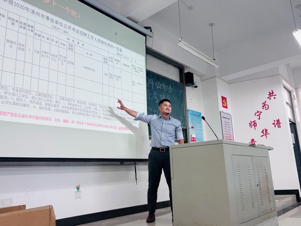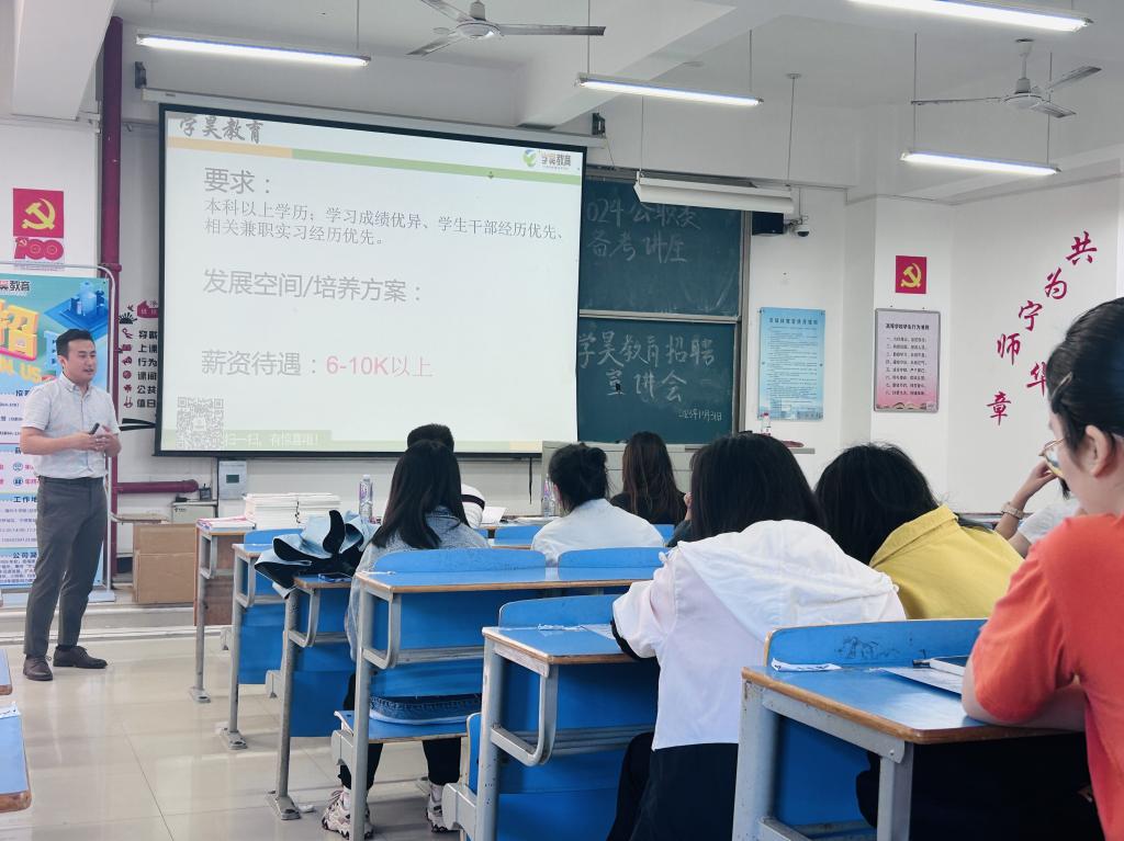 首先,学昊教育游思泽老师从对公职考试的全面剖析、大三和大四的学生如何准备公职考试以及注意事项、如何根据本专业选择合适岗位三个方面入手,带领同学们初步认识“考公”。接着,学昊教育雷炜锋老师介绍学昊福建各地市招聘岗位。同时,学昊教育雷炜锋老师向同学们讲解学昊教育的发展历程与未来展望,提醒同学们要提前做好就业准备。在宣讲会临近尾声时,学昊教育雷炜锋老师介绍了薪资福利结构,真诚的邀请十大网投官网学生加入学昊教育实现自我理想。