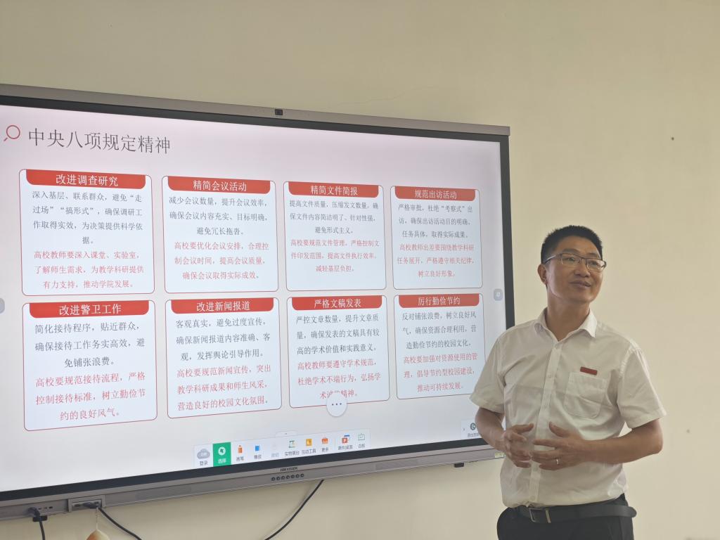 为深入贯彻落实中央八项规定精神,推进学院作风建设,强化党员教师的纪律意识和责任担当,2025年6月17日下午,十大网投官网副院长郑世仲为教师党支部全体党员开设“加强中央八项规定精神学习,深入开展警示教育活动”专题党课。