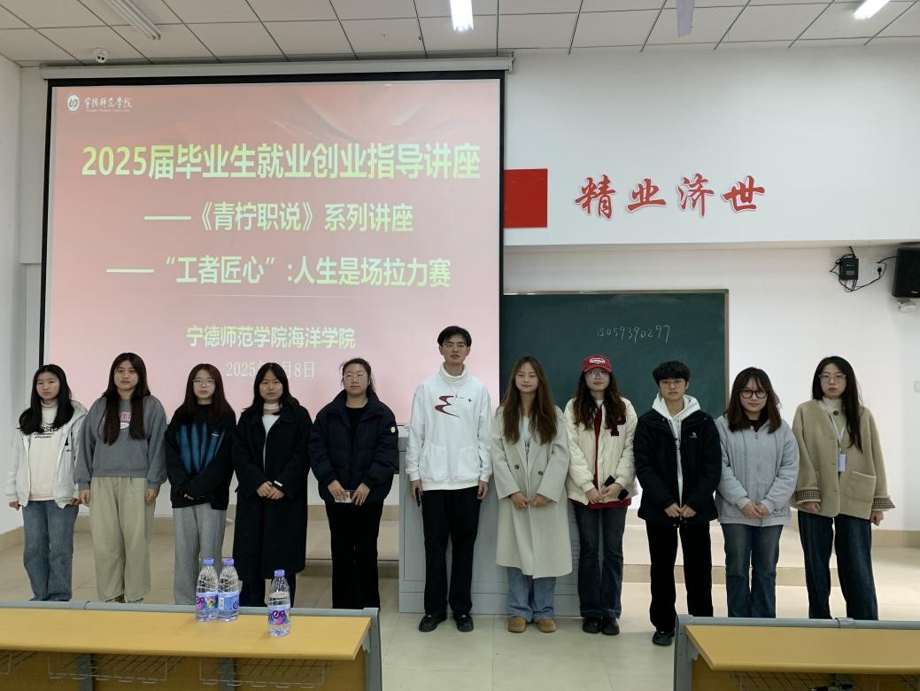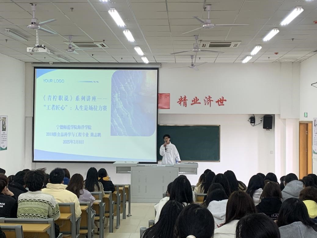 讲座开场,陈志鹏以自身经历为引,迅速抓住了听众的注意力。他回顾了自己从校园踏入社会的历程。他讲到2022年毕业以来,他在实践中成长,探索过许多不同类型的职业,从福建平安产险有限公司的查勘员,到安发(福建)生物科技有限公司的食品技术员,再到福鼎市人民法院的录入员,现今到霞浦县海洋渔业发展中心成为一名工作人员。每一段职场经历,都是他人生赛道上的宝贵积累。
