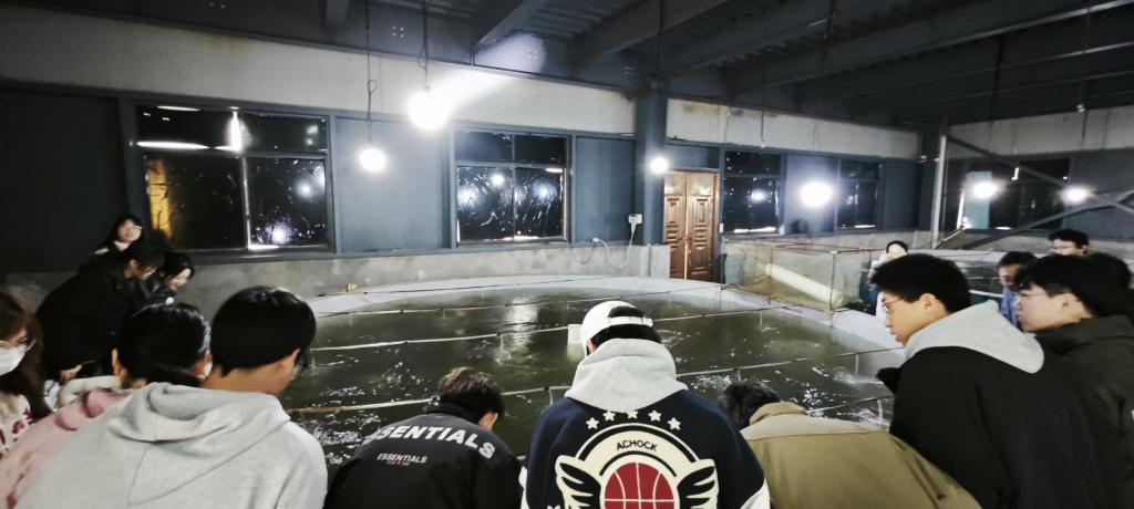 随后,师生们来到以也公司的乌鱼培育养殖基地,在技术工程师江孝泉,朱河锦,施翩等相关公司人员的带领下详细参观了解以也公司的乌鱼培育情况,培育历程与培育成就师生们近距离观察了处于不同生长阶段的乌鱼种群和适应不同需求的乌鱼培育池,更加深刻的认识到在宁德市作为中国水产养殖重镇的行业背景下,以也公司的乌鱼培育实践不仅体现了企业技术创新的引领性,更深度融入地方海洋经济发展的战略布局。